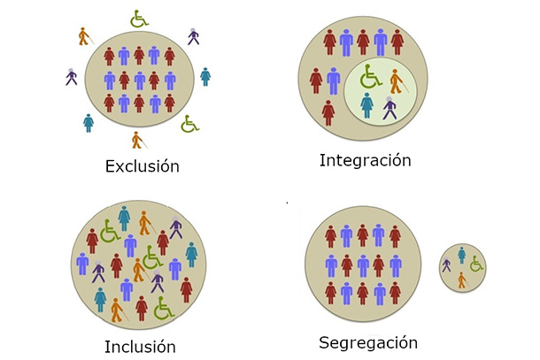 A continuación te presento una imagen que representa gráficamente las diferencias entre exclusión. segregación, integración e inclusión:
