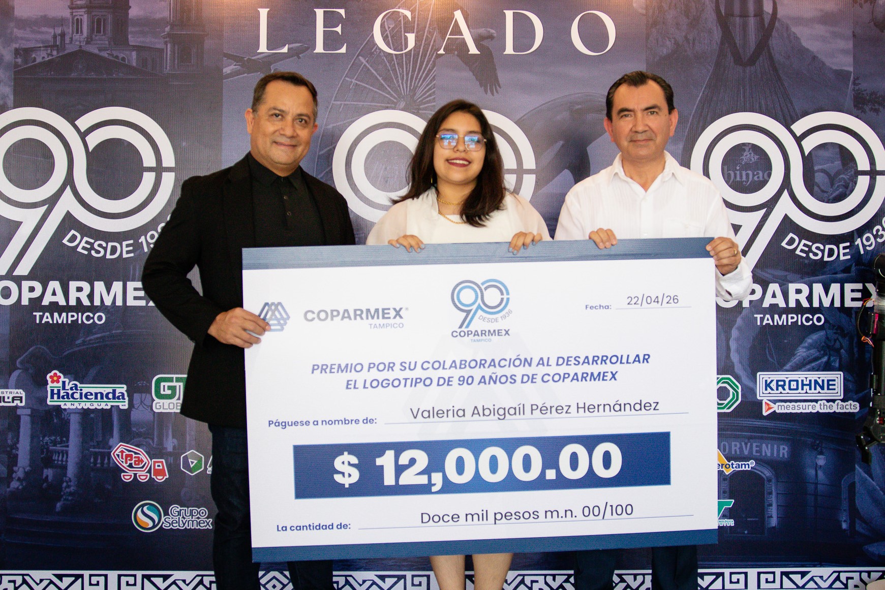 En este contexto, uno de los momentos más destacados fue el reconocimiento a Valeria Abigaíl Pérez Hernández, alumna del IEST Anáhuac, quien obtuvo el primer lugar en la convocatoria para el diseño del logotipo oficial del 90 aniversario de COPARMEX Tampico.