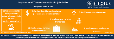 Infografía que resume los últimos resultados de turismo internacional de México en términos de las afectaciones por efecto de la pandemia de Covid-19. Con datos de Inegi al mes de octubre de 2020.