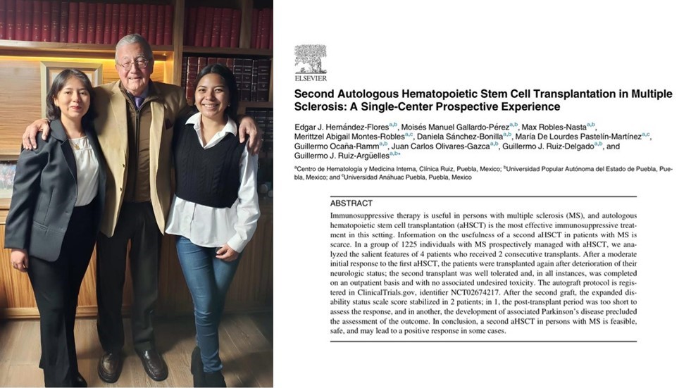 En un esfuerzo por avanzar en el tratamiento de la Esclerosis Múltiple (EM) y brindar esperanza a quienes padecen esta enfermedad, el Dr. Guillermo J. Ruiz Argüelles, junto con las alumnas Merittzel Abigail Montes Robles y María de Lourdes Pastelín Martínez, de la Escuela de Ciencias de la Salud de la Anáhuac Puebla, han publicado un artículo de investigación titulado "Second Autologous Hematopoietic stem cell Transplantation in multiple Sclerosis: a single-center prospective experience".