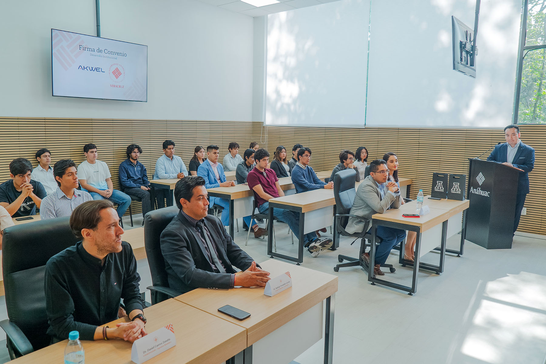 Tras dar la bienvenida a los presentes, el Dr. Linares agradeció al Ing. Meraz y al equipo directivo por su presencia, así como por la buena disposición por parte de AKWEL para estrechar esta alianza. Enfatizó la importancia de este convenio con una empresa líder en la industria automotriz, el cual permitirá conectar a los estudiantes con el sector productivo, brindándoles la oportunidad de adquirir experiencia y fortalecer su formación académica mediante prácticas profesionales. Finalizó mencionando que la Universidad Anáhuac Veracruz tiene como misión servir a la sociedad mediante la formación de profesionales íntegros, no solo en lo académico, sino también en valores humanos y espirituales, y que dicha alianza coadyuvará a preparar a los jóvenes para enfrentar los retos del mundo laboral con ética y responsabilidad.